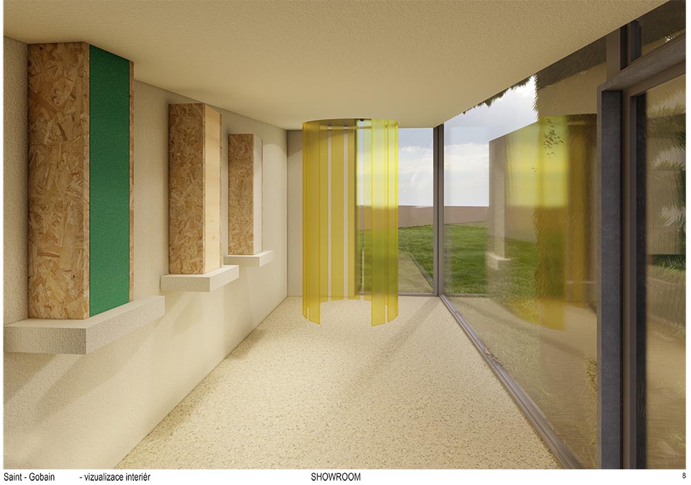 prezentačních panelů s jednotlivými druhy designových omítek od firmy Weber. Prosklené stěny