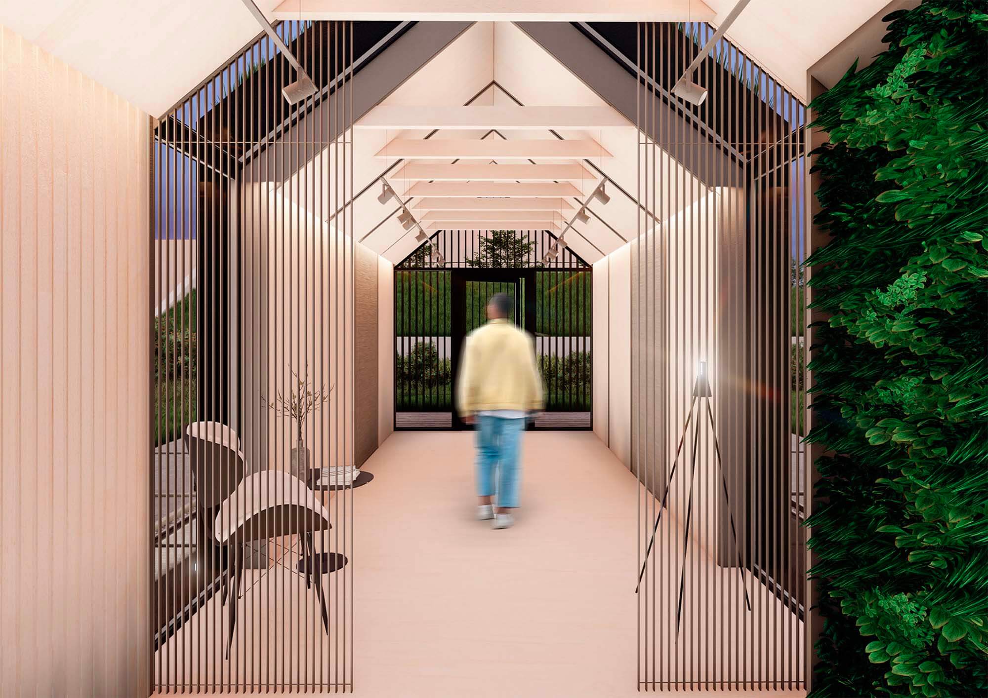 Tento tvar zkoseného obdélníku jsem zvolila kvůli zajímavému půdorysu. Vytvořila jsem průchod,